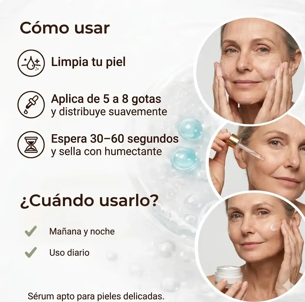 - Aplica: 6 a 8 gotas sobre el rostro limpio (mañana y noche).